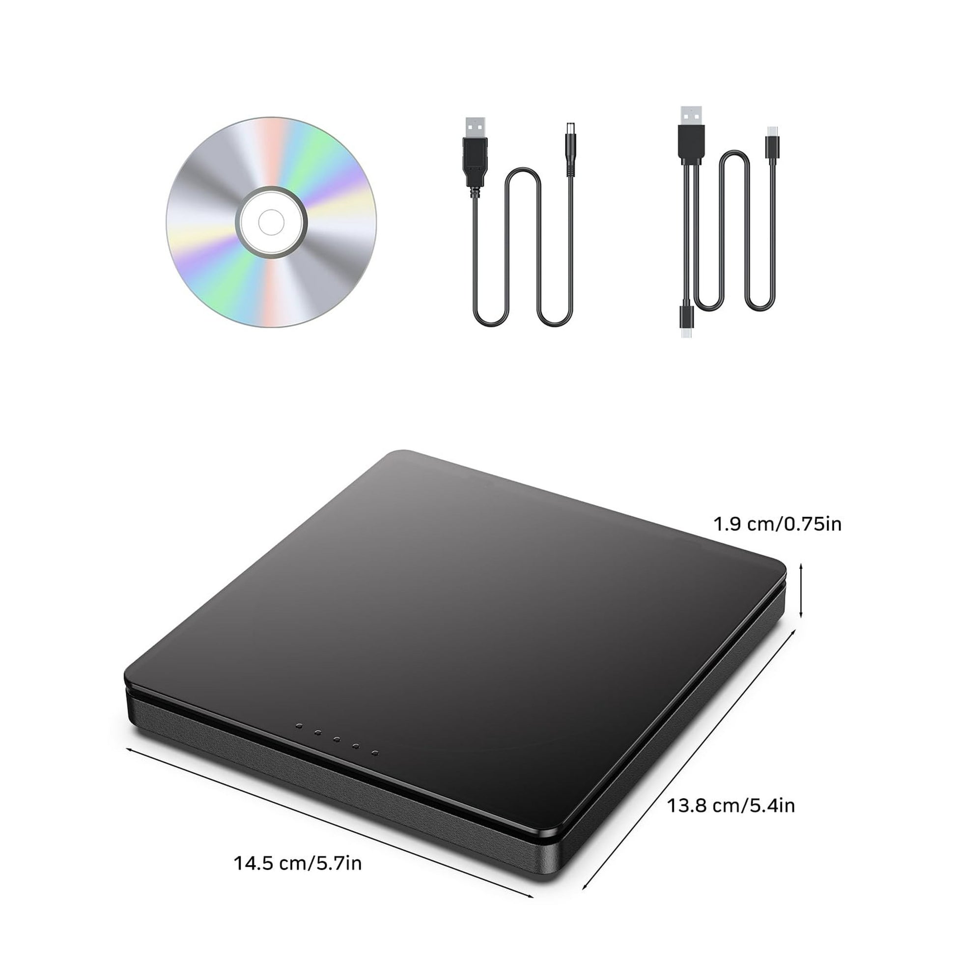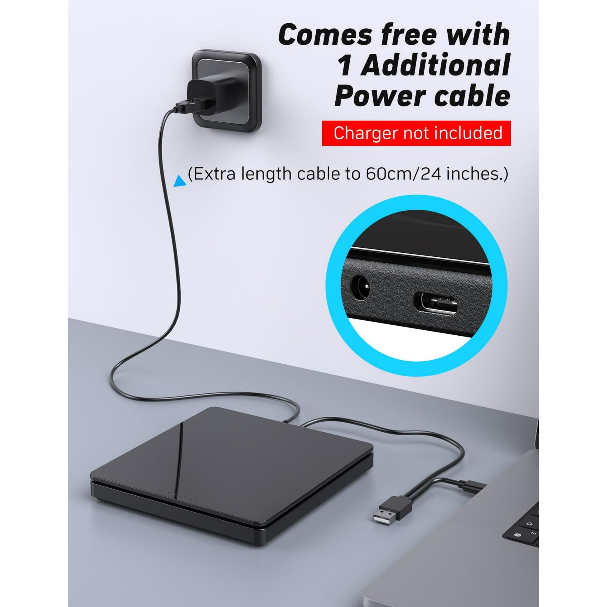 - 【Extended USB 3.0 Data Cable& Power Assurance】20 inches Extended Data Cable data cable with USB 3.0 type-A and type-C connectors, makes it easier to plug the DVD drive into different laptops and PCs with any adapters, and no worries about losing data cable. We also considerately prepared with a 25 inches power supply cable, in the event your computer can't provide ample power through a single data cable, simply utilize the additional power supply cord. Connect it to another USB port on your PC or use a 5V USB power adapter for an extra power boost. (Note: The power cord is not a data cable; avoid using it independently.)